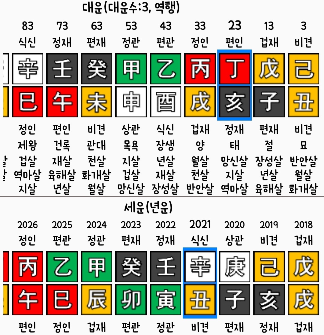 지금이 22세~31세 정해(丁亥)대운인데 매우 좋은 시기다. 정화 편인이 들어와 화생토, 토생금되어 신약한 자신을 생조하고 그 결과가 세상에 끼와 춤으로 발산된다. 세운 천간에 식상이 뜬 2020년과 2021년에는 자신의 끼와 재능이 외부에 완전히 드러났고 올해는 비견과 식신이 들어오니 작년보다 훨씬 좋다.