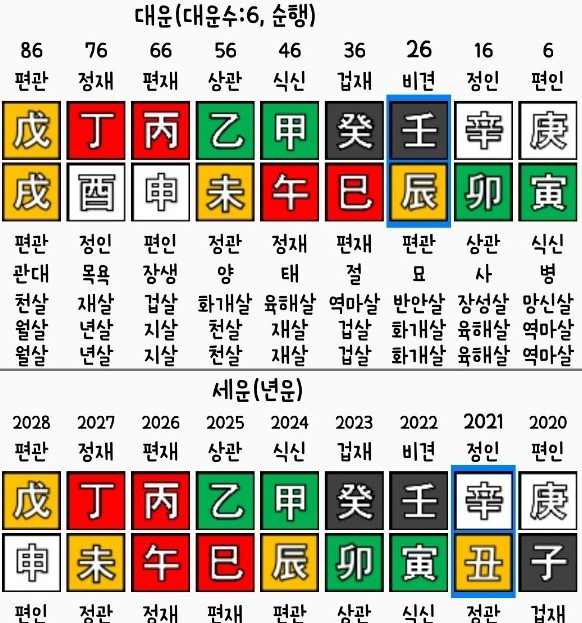 작년 2020년과 올해 2021년 둘 다 세운도 그저 그랬고, 내년 2022년부터 2025년까지 세운에서 식상이 들어와 줘서 숨통이 트이고 연예인으로서의 재능을 발휘한다. 31세, 32세가 되는 2025년과 2026년은 상관과 재성이 같이 들어와서 외부의 스포트라이트를 많이 받고 개인적으로도 매우 행복한 시기다. 46세~55세 甲午대운이 매우 길한데, 지지 화와 식상 세운이 들어오는 40세 (2034년)부터 일이 잘 풀리고 순조롭다.